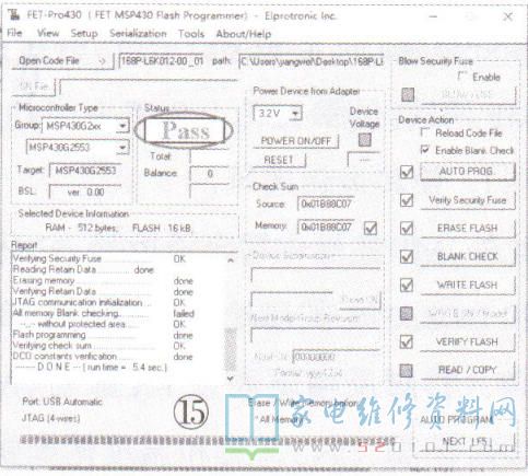 当出现“Pass"字符后如图15 所示,表示软件烧录已完成。
