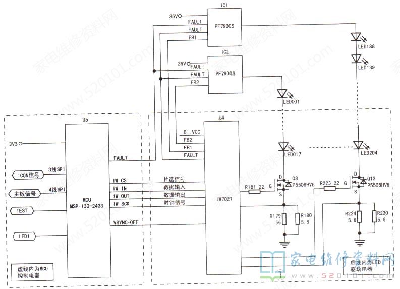 创维168P-L5K015-00型电源二合一板主要用于创维55X5、50U2.55M5型等液晶彩电中,其灯条控制电路如图1所示,主要有以下三大部分:一是LED灯供电电路,主要由升压控制芯片IC1、IC2(均为PF7900S )及其外围元件组成,36V电压经升压得到V-OUT1.V-OUT3供电电压,供给12路灯条;二是LED条灯驱动电路,由驱动控制芯片IW7027(U4 )及外围元件组成;三是MCU控制电路,由MCU芯片MSP430-2433(U5 )及其外围元件组成。