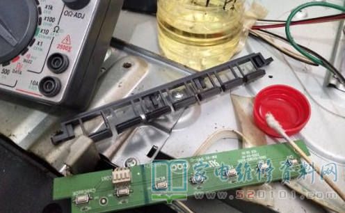 接修一台创维42M10HF液晶电视机,故障现象是不定时自动开关机,音量有时自动增加,有时自动减小,按每一个按键都非常不灵敏,有时同一个按键按10来下也不能执行相应的功能,有时按音量减键,音量却是增加,切不稳定,有时按信号源键,却进入菜单状态……拆机测量按键,每个按键在按下的状态阻值均大于100Ω(MF47表R×1档)。本机按键是贴片按键,手头没有现货,就用酒精清洗。具体清洗步骤:用棉签蘸酒精贴在按键一侧,同时反复按压按键,一般按压20次左右,按键即可修复,即解决了接触不良的故障,又解决了按键漏电的故障。
