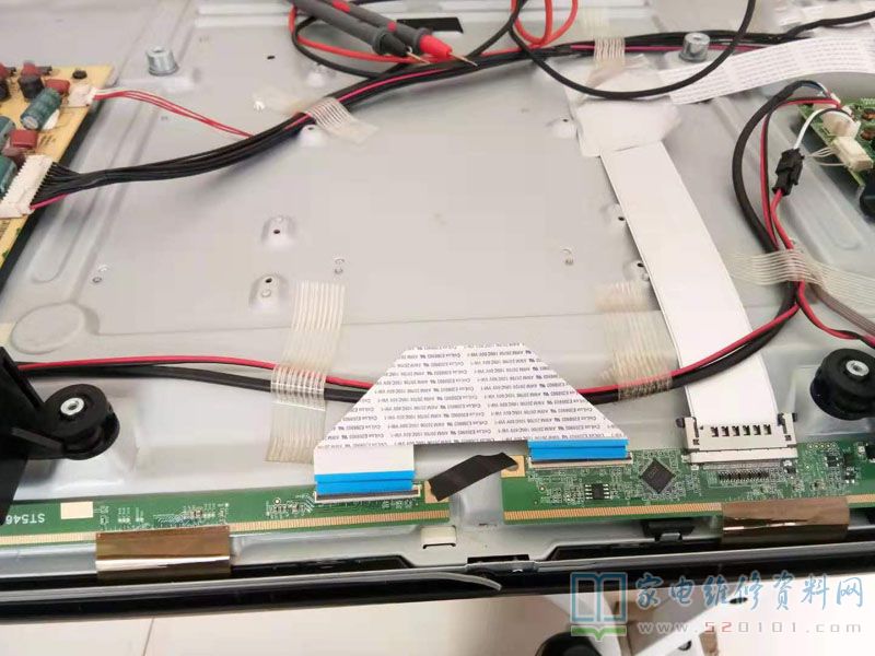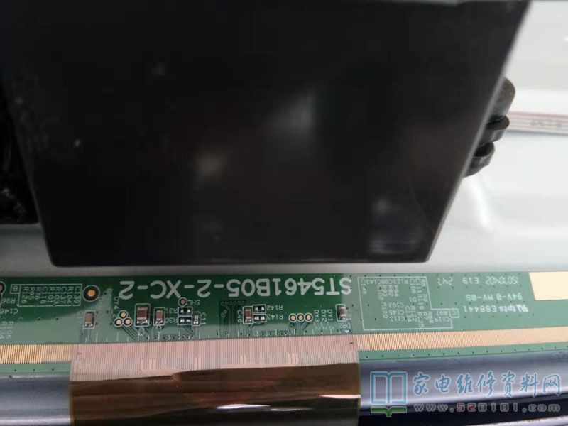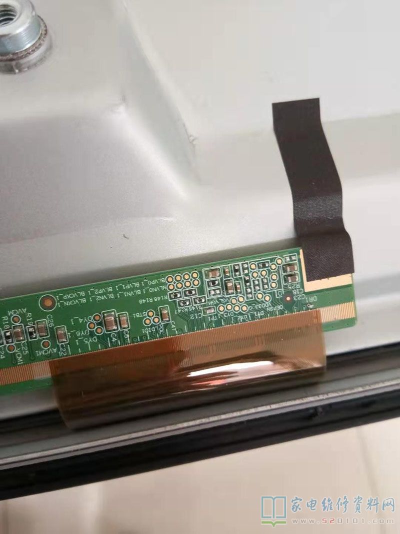 于是用万用表测出右边排线逆数第14、15根是跟VGH相连接的,就把那两根隔离起来,剪一小段修手机用金黄色的耐热胶纸,直接贴在14、15排线触点上绝缘,插好后试机,果不其然,图像完美呈现。试机一天没有变化,交付给用户使用。