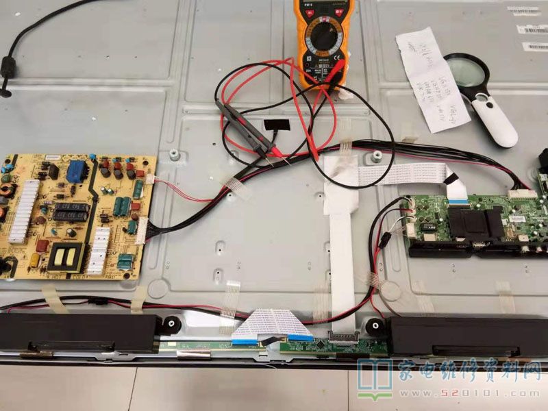 拆机,发现此电视机没有单独逻辑板,主板排线直接到屏边板。因为能够开关待机,背光也亮,就没有去检测电源电压,直接去测上屏电压,12V正常,屏边板入电保险正常,VDD33-3.3V正常,VGH电压为0,VGL电压-5.8V,看来问题出在VGH电压上面。屏边板是左右两块板通过排线连接在一起的,拔掉排线,测试,发现VGH电压26V起来了,大喜,再看屏幕,拔掉的那边是白屏,这边屏从原来的灰屏变成了红绿蓝白交替变换的状态,象是屏自检一样。