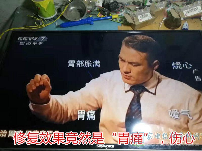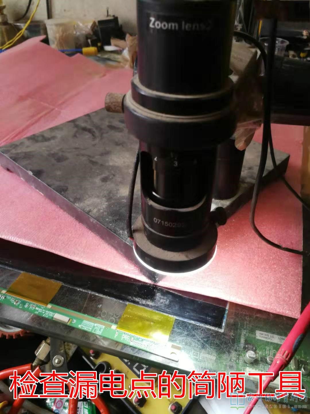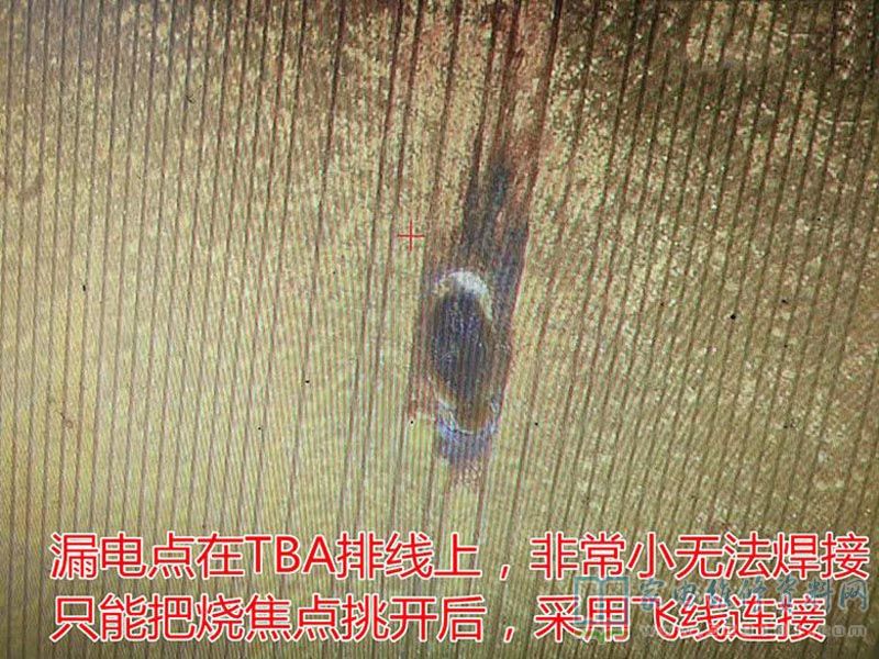 用电子镜来检查VGH和VGL的漏电点,发现是在TBA模块上,两线之间有一点极小的烧焦痕迹,这痕迹小到肉眼看不出。我没有焊接TBA的压屏设备,故处理方案是把烧焦点挑开,然后用飞线从屏耳朵连接到屏边板,效果完美。