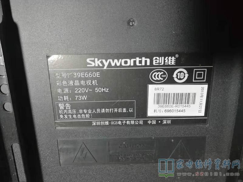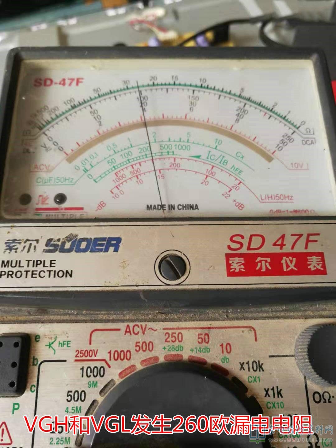 接修一台创维39E660E液晶电视机,故障现象是有声无图,有暗淡光(灰屏),因本故障涉及到屏幕,修理难度大,风险系数高,故先和用户谈好价钱和风险情况,拆机,直奔屏幕的工作条件VGH,测量为零伏,再测量VGH(黑笔)和VGL(红笔)电阻,发现有260欧阻值,故障明显是这两组电压线路发生漏电短路了(这是灰屏故障比较常见的现象),破坏屏幕的工作条件,所以屏幕就不能显示图像了。