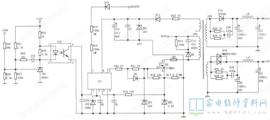 接修一台创维32E360E型液晶彩电,故障表现为开机三无。拆开后盖,通电试机,测得市电整流滤波电路输出电压为320V,但开关电源次级输出的+ 12V、+24V电压均为0V。断电后,320V电压长时间不下降,判断开关电源初级电路有问题。该机电源芯片IC1的丝印为35A65,实绘电路如图1所示。