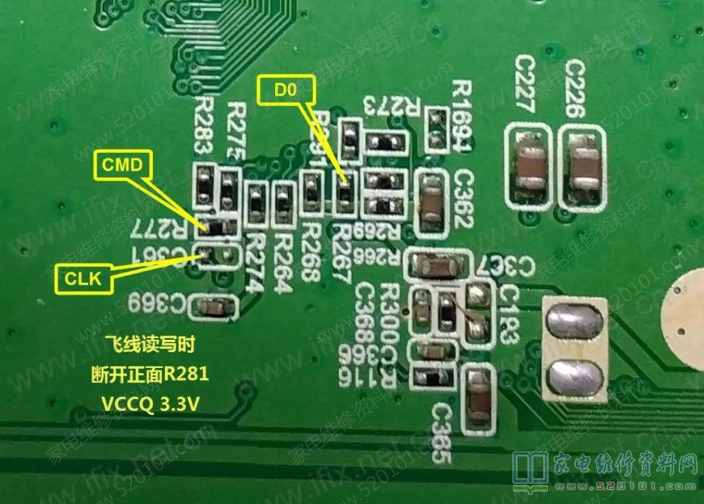 创维液晶电视8S52机芯EMMC飞线点位图 2022-04-02 21:35:59 阅读 975 次 评论 0 条 摘要: 创维8S52机芯的EMMC飞线读写的点位CMD、CLK、D0如下图所示,飞线读写时要断开正面的R281 VCCQ 3.3V。 创维8S52机芯的EMMC飞线读写的点位CMD、CLK、D0如下图所示,飞线读写时要断开正面的R281 VCCQ 3.3V。 版权声明:本文为转载文章,版权归原作者所有,欢迎分享本文,转载请保留出处! 点赞 分享: PREVIOUS:创维32E3500液晶电视(9R43机芯)EMMC点位图 NEXT:创维42E660E液晶电视(8R96机芯)EMMC点位图 文章导航