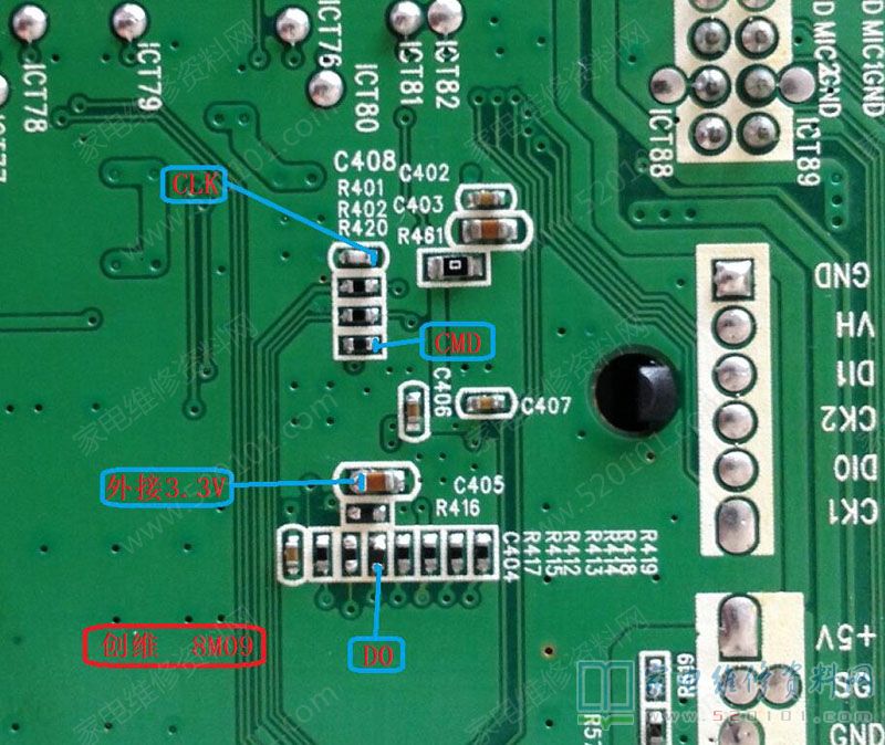 创维液晶电视8M09机芯EMMC飞线点位图 2022-04-02 21:47:56 阅读 846 次 评论 0 条 摘要: 创维液晶电视采用8M09机芯主板的EMMC飞线读写CLK、CMD、D0、外接3.3V点位如下图所示。 创维液晶电视采用8M09机芯主板的EMMC飞线读写CLK、CMD、D0、外接3.3V点位如下图所示。 版权声明:本文为转载文章,版权归原作者所有,欢迎分享本文,转载请保留出处! 点赞 分享: PREVIOUS:创维液晶电视8S06机芯主板EMMC飞线点位图 NEXT:TCL液晶电视板号4704-M608T9-A5233K01 MS6A608T9 EMMC点位图 文章导航
