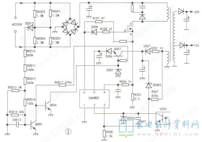 先不装开关管,上电后测得开关管的G、S电压较小且波动,看来电源芯片已输出驱动脉冲了。装好开关管,为安全起见,在交流电源输入端串联一只60W/220V的白炽灯泡,上电后测得12V输出电压在6V~8V之间波动。查看线路,发现三极管QOD7的b极与QOD6的c极相连,这应是市电电压欠压保护电路,市电由RX0D1~RX0D4分压取样DOD10整流R0D10~R0D12和R0D13~R0D15降压分压,加到QD05的b极。