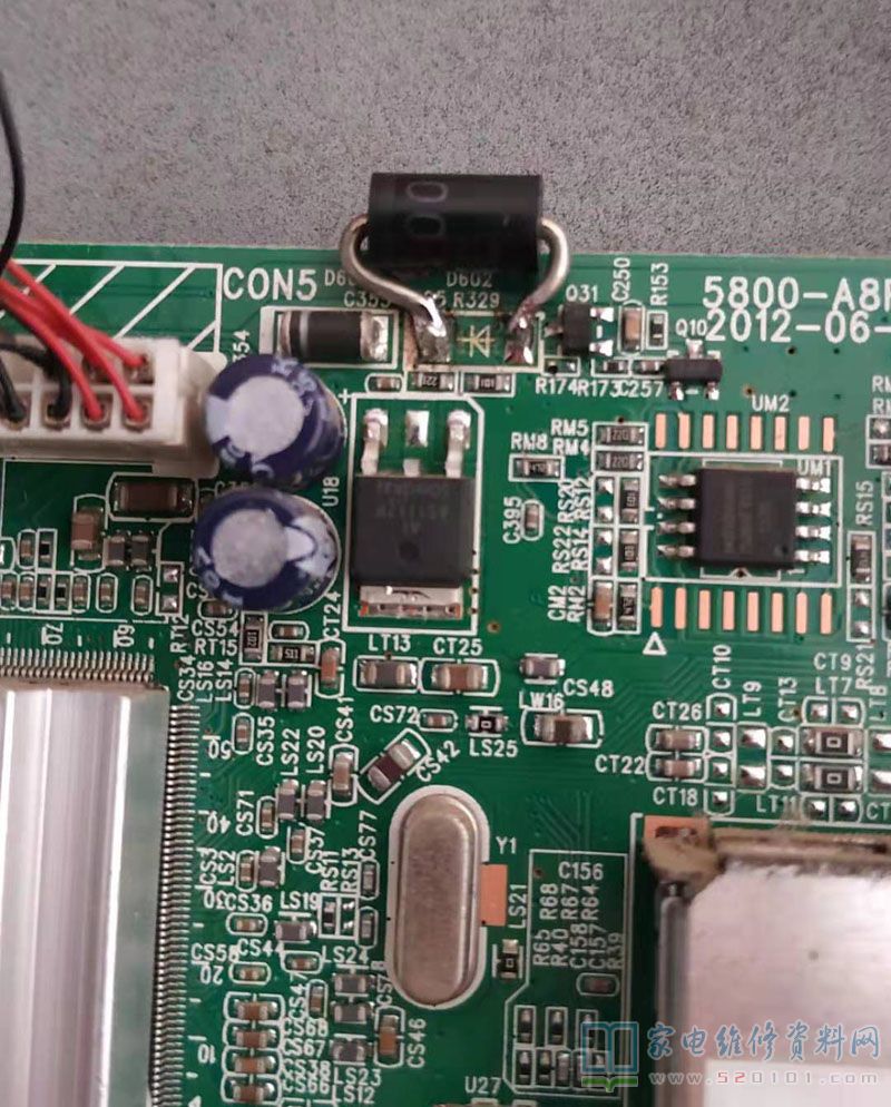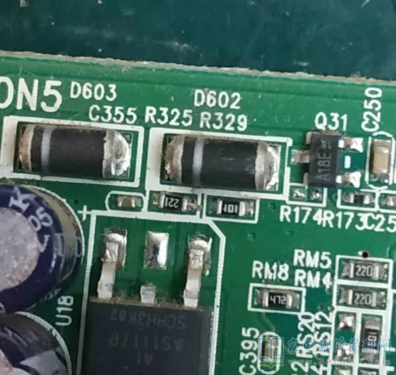 创维一台32E500E液晶电视,故障表现是指示灯亮绿色不开机,先检查电源板所有电压正常,再检测主板,发现U18供电1.3V,输出0.65V,不正常,此IC供电输出应该在1.2V左右。测量D602正极电压5.1V,负极电压1.8V,不正常。用二极管电压档测试D603两端为0.6V,D602两端OL,烙铁拆下再测量D602又好了。重新焊上电压又正常了,为了保险起见,将D602更换掉。观看了两个小时,交付给用户使用。