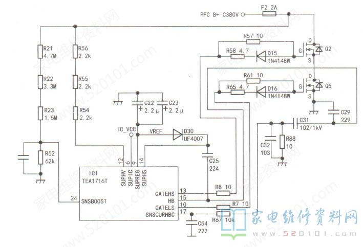 为防止误判,笔者用自制测试仪,测量灯条(灯条插座CON3上标注LED1+ LED2+电压均为75V,LED3+电压却为40V)都能正常点亮,这基本排除灯条异常引起电源板保护的可能性。在检测中发现,PFC电压一直为稳定的380V ,看来故障在LLC电源电路。检查IC1外围元件,发现⑦脚外接贴片电容C54破裂(相关电路见图1)。换上一只2200pF的瓷片电容后试机,故障排除。