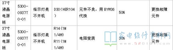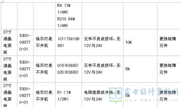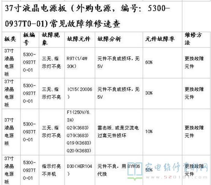 附:创维37寸液晶电源板(5300-0937T0-01)常见故障维修速查表如下图所示。