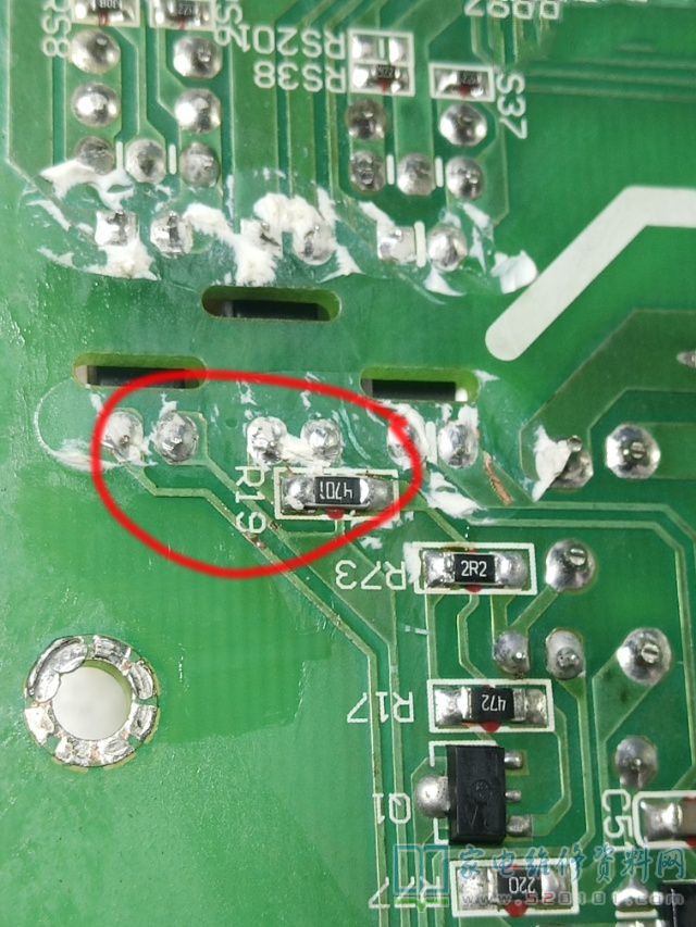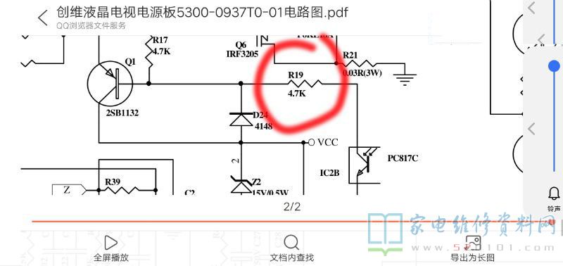 接修一台创维37L17SW液晶电视,采用的是5300-0937T0-01电源板(图纸),故障表现为开机半小时后出现屏自检,红绿蓝白色反复,声音无,重新开机,又好了,检查发现R19开路472为无穷大,换4701后故障排除。