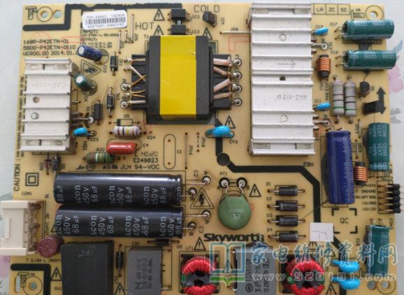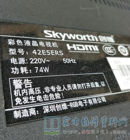 接修一台创维42E5ERS液晶彩电,故障表现为三无。拆机检查,发现保险管F1开路,尖峰电压吸收电容C23(1000pF/2kV)烧焦,整流桥的二极管等元件未见异常。更换F1、C23后通电试机,故障排除。