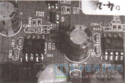 断电,检测U21③脚外接负载,无短路现象,判断U21损坏(见图1)。将U21换新后通电试机,故障排除。此时测得U21③脚输出电压为1.18V,电源板上ON/OFF端电压为4.2V,BL-ON端电压为3.2V,BL-ADJ端电压为3.3V。