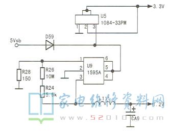 一台创维32L01HM型液晶电视,上电后红色指示灯亮,不开机。分析检修:上电查看开机打印信息(需把波特率设为“9600"), 没有显示。测开关电源输出的5Vsb电压为5.2V(正常),但12V、24V电压为0V,主板送给电源板的Power信号电压为0V,说明故障在主板上。U5( 1084-33PM )输出电压为3.3V,正常,但1.2V电压很低。断开1.2V负载,1.2V电压仍很低,说明故障出在以U9为核心的转换电路中,如图所示。