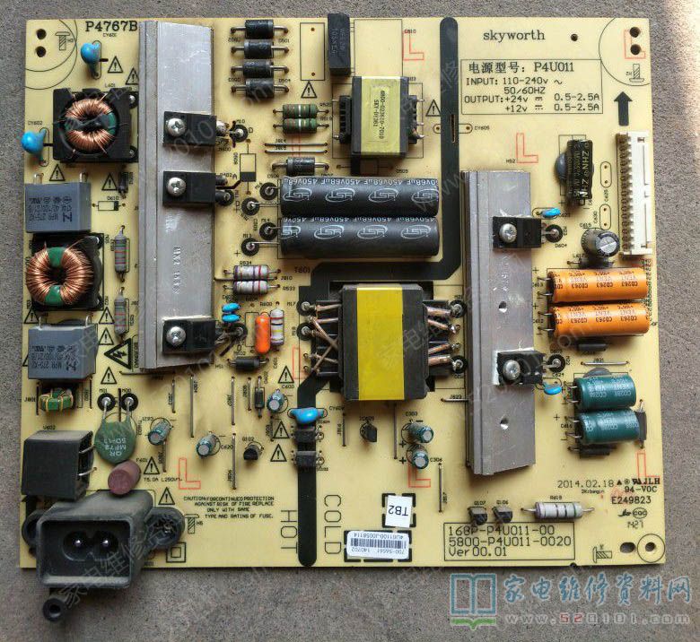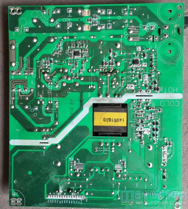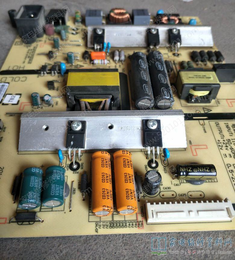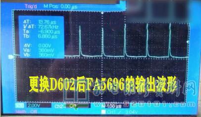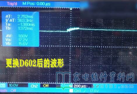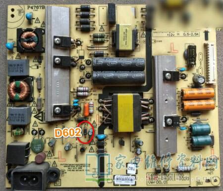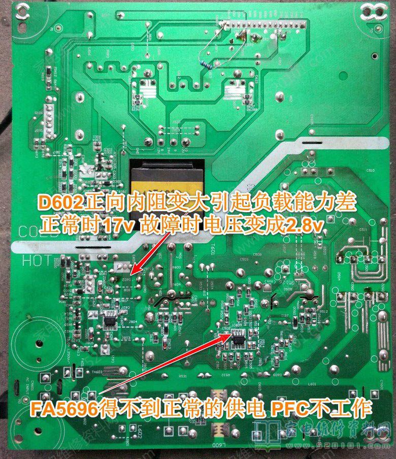 接修一台创维49E510E液晶电视,输出24V、12V两组,带载后屏幕一亮一亮的,检查两个主电容电压待机时341C输出20V,9V,开机后20V-26V闪烁,7-11V闪烁,341V不变(带PFC的电源板,主电容两端的电压在380-400V之间才算正常,主电源才能正常的工作),所以判断是PFC电路没有工作,检查PFC芯片的各引脚工作电压和芯片的输入电压,FA5696得不到工作电压,最后找到原因是D602正向电阻变大引起的,更换后故障修复。