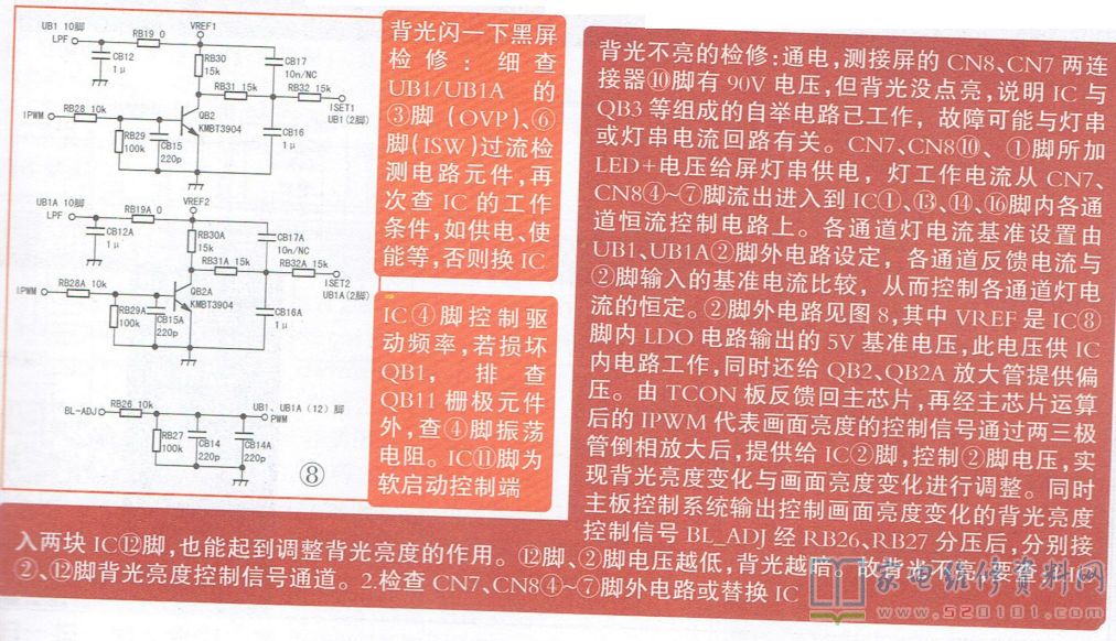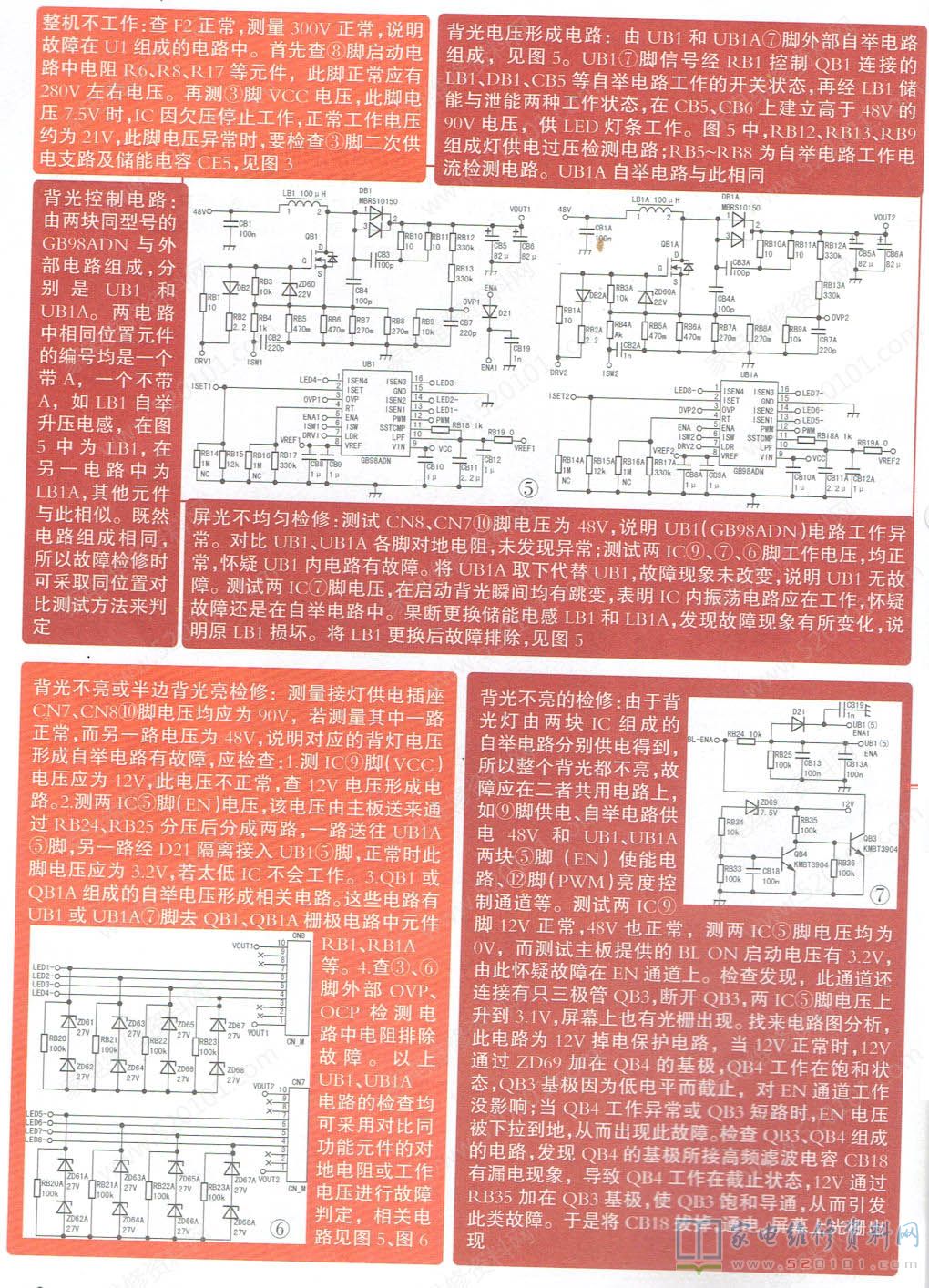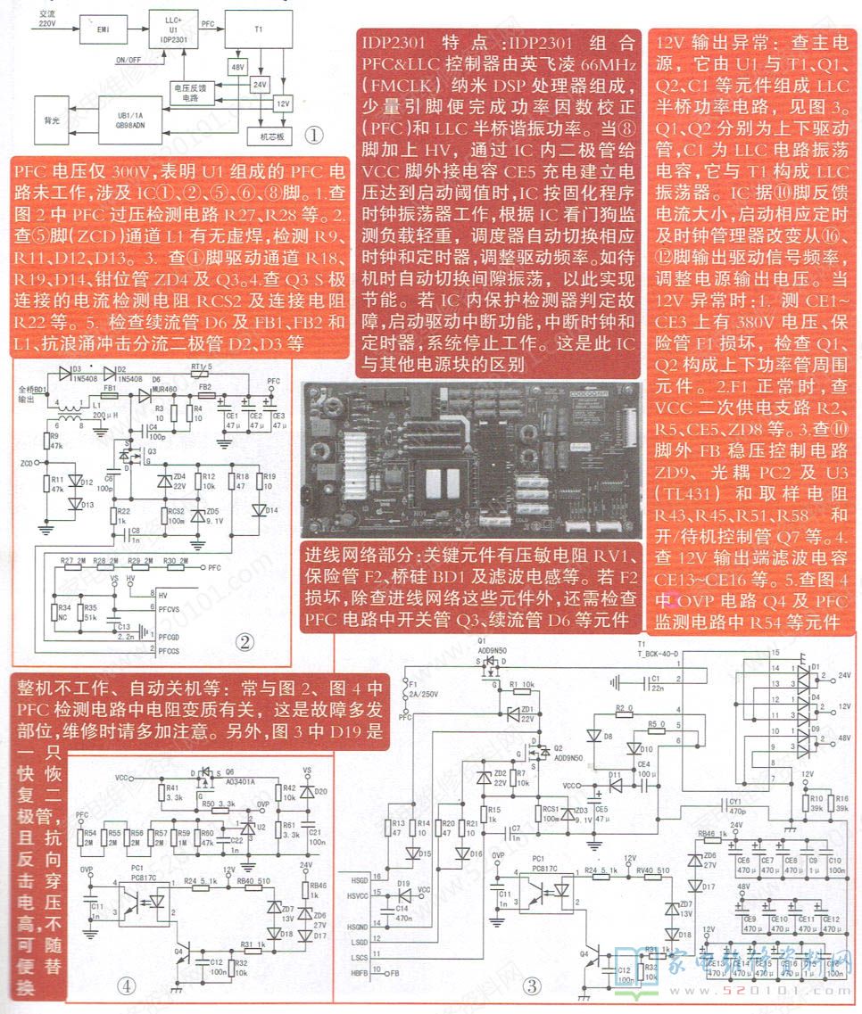 创维168P-L6J014-00电源板维修资料(图) 2022-05-13 17:39:54 阅读 718 次 评论 0 条 摘要: 创维168P-L6J014-00电源组件采用IDP2301(U1)作PFC校正电路,同时该芯片与半桥上下管Q1.Q2、变压器T1初级、C1组成半桥LLC功率主电源,产生供主板和背光电路工作所需的12V、2 创维168P-L6J014-00电源组件采用IDP2301(U1)作PFC校正电路,同时该芯片与半桥上下管Q1.Q2、变压器T1初级、C1组成半桥LLC功率主电源,产生供主板和背光电路工作所需的12V、24V、48V。主电源中,Q4、PC1组成OVP检测电路,Q7控制U3与光耦PC2相关元件组成开/待机电路,两只GB98ADN组成背光电压形成及恒流控制电路。整个电源架构组成如图1所示。 版权声明:本文为转载文章,版权归原作者所有,欢迎分享本文,转载请保留出处! 点赞 分享: PREVIOUS:海信LED32K1800液晶电视开机三无的故障维修 NEXT:长虹AMPM40S-1M2 3A5电源板维修资料(图) 文章导航