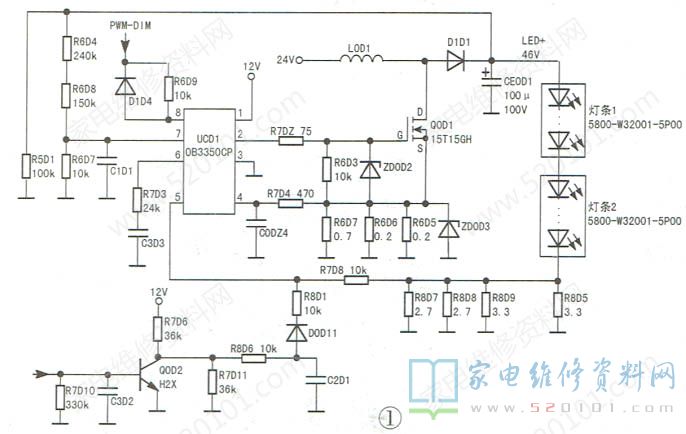 该电压经续流二极管D1D1续流,产生约46V直流电压(LED+),供给LED灯条。该机屏里面有两根串联的灯条(灯条型号是5800- W32001-5P00),每根灯条由7只灯珠串联而成。实测灯条电流为400mA。过压保护:该电路由取样电阻R6D4、R6D8、R6D9,电容C1D1及UCD1⑦脚(过压保护输入)内部电路组成。若LED+升高,则⑦脚电压升高,当达到保护阈值时,uCD1进入过压保护状态,切断②脚脉冲输出,Q0D1截止,LED+电压降为24V。过流保护:该电路由取样电阻R6D5~R6D7及UCD1④脚内部电路组成。若流过QOD1电流增大,则UCD1④脚电压升高,当达到保护阈值时,此uCD1进入过流保护状态。R8D5~R8D7为灯串电流检测电阻,改变该电阻的阻值,就可改变流过灯条的电流。