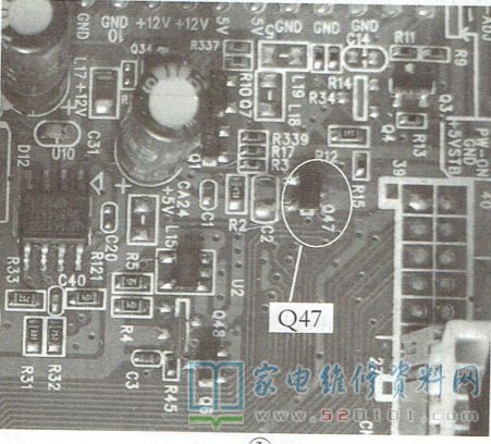 接修一台创维26S15HM液晶电视,开机后白屏,伴音正常。拆开机壳,目测电源二合一板(板号为5800-P26TQM-0110)和主板(板号为5800-A8M200-0000)上均无明显损坏的元件。上电,测得电源二合一板输出的5V和12V电压均正常,但上屏插座CN12中无12V电压输出。断电,在路检测上屏供电电路,发现上屏供电开关管Q47(H5Vb)引脚间阻值异常。因笔者手头无同型号的P沟道场效应管,于是从报废主板上拆下一只丝印号为WyG4G的P沟道管换上,如图1所示。通电试机,故障排除。