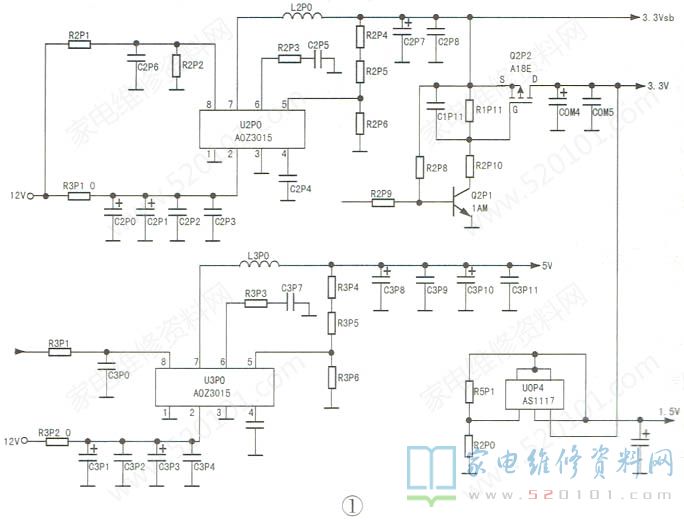 方波经芯片内部续流二极管整流,在滤波电容C2P7、C2P8.上产生3.3V待机电压。U2P0⑤脚为反馈端,⑥脚为环路补偿端。3.3V电压形成:二次开机后,三极管Q2P1因b极得到高电平开机信号而饱和导通,P沟道场效应管Q2P2的G极电压被拉低到0.6V,Q2P2导通,D极输出3.3V电压。UOP4( AS1117)为低压差三端稳压器,其作用是把3.3V电压稳压成1.5V。