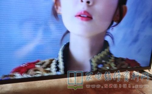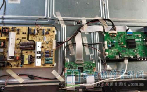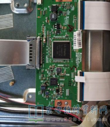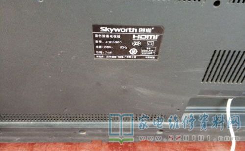 接修一台创维43E6000电视来修,故障表现为伴音正常,图像跳动乱闪,有时屏幕变了浅黄色,字符跳动,屏幕下方出现黑色横线条闪动,判断屏幕故障。拆机直奔逻辑板,测量上屏电压12V正常,VGL电压-5V,VGH电压28V。此时观察图像还是跳动,老办法拆掉左边屏线,屏幕一半黑屏,一半白屏。再拆右边屏线,一半白屏一半出图像正常了,屏幕故障无疑,查屏参LG屏,似乎没有可修的地方,只能贴纸片解决了,剪了一小条纸片贴上去,全屏正常图像出来了,故障修复。