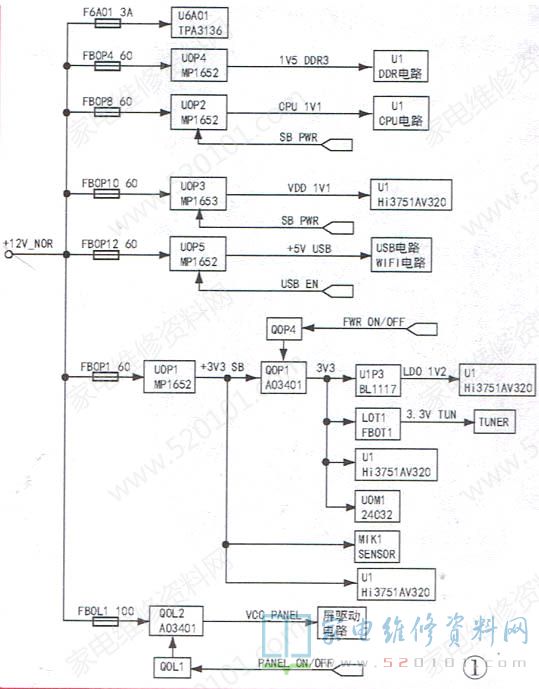 创维8H35机芯液晶彩电信号处理电路的供电系统结构框图如图1所示。电源送来+12VNOR供电,经各稳压电路稳压或变换电路变压后,送给相应的电路。+12V NOR供电分七路一路经F6OA1给U6A01(TPA3136)电路供电:一路经Q0L2得到vCC PANEL,给屏驱动电路供电:一路经UOP4(MP1652)变换得到1V5 DDR3,给主芯片内置DDR电路等供电:一路经UOP2( MP1652变换得到CPU 1V1, 给主芯片中的CPU电路等供电;一路经UOP3(MP1653)变换得到VDD 1V1,给主芯片中的GPU等电路供电;一路经U0P5( MP1652 )变换得到+5V USB,给USB、WIFI等电路供电;一路经U0P1(MP1652)变换得到+3V3 SB,给主芯片、遥控电路等供电。+3V3 SB供电经Q0P1(AO3401A )得到3V3,给主芯片、高频头、UOMI等相关电路供电。