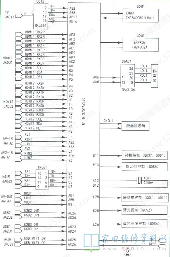 创维8H35机芯信号处理电路系统结构框图如图2所示。U1(Hi3751AV320)为 主芯片,UOM4( THGBMDG5D1LBAIL )为EMMC, UOM1(24C32)为EPROM, U6A01(TPA3136 )为音频功放。