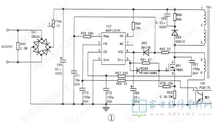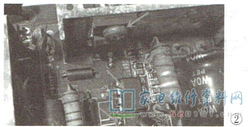 根据经验,怀疑电源芯片IC7( NCP1207A)已损坏。将上述损坏元件全部更换后开机,还是没反应。测量C68两端电压在8V左右波动,正常值约为12V,说明电源没起振。进一步在线检测 ,发现R67开路(见图2),换新后开机,故障排除。