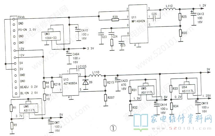 续流二极管D9对脉冲进行整流,在滤波电容CA23上两端产生5V直流电压。U11、U13的引脚功能如下:①脚为场效应管驱动栅极输入端,外接升压电容。②脚为供电输入端。③脚为功率开关管输出端,外接储能电感与升压电容。④脚为接地端。⑤脚为反馈输入端,内部电路根据此脚反馈电压调节输出电压值。⑥脚为补偿端。⑦脚为使能端,即开/关控制端。⑧脚为软启动控制端,外接电容,电容的容量决定软启动时间长DDR 电路的2.5V和1.25V供电分别由UW5(AS1117L)和UW4(AS1117L)完成,将输入的5V电压分别稳压为2.5V和1.25V。UW5和UW4①脚取样分压电压值分别为1.3V和0.2V。