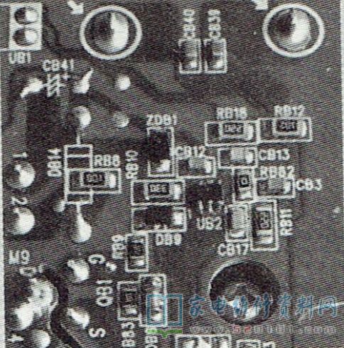 及诶徐一台创维24E600E型液晶电视,上电后电源指示灯不亮不开机。拆开机壳,目测电源二合一板上无异常元件。先用220V灯泡对主滤波电容C39(68uF/450V )放电,然后用万用表测保险丝F1(3.15A/250V)、整流二极管C39及次级整流滤波元件均正常。取下电源二合一板,单独检测C39两脚电压为300V(正常),次级12V和24V输出电压均为0V,电源集成块UB2( 73E36 )的供电端⑤脚电压也为0V。断开UB2的⑤脚铜箔(如图1所示),上电测得UB2⑤脚外接滤波电容CB41两端电压为12V (正常),但接上划断的铜箔后,CB41上的电压立即降为0V,据此判断UB2损坏。换上一只丝印为73127P的电源集成块后装机试验,故障排除。