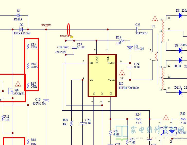 接修一台创维37M11HM液晶电视,顾客反映开机指示灯一闪,没有反映了。打开后盖,测量5V 12V 24V 只有5V电压,12V、24V均为0V,该机PFC电路通过继电器吸合接通,5V正常继电器一端有19V电压不吸合,怀疑数据有问题,更换数据,开机继电器吸合,PFC 380V正常,12V24V还是无输出,在路测FSFR1700的23456脚阻值为0,更换FSFR1700,发现后级TL431炸裂,同时更换,测试其他无明显短路,试机正常。