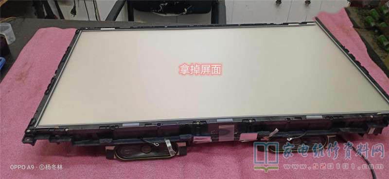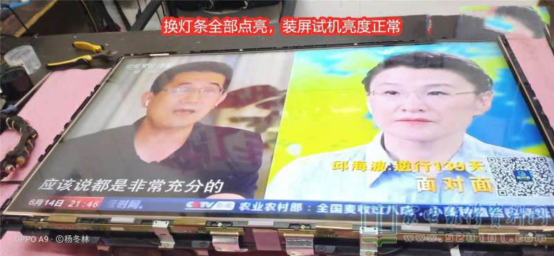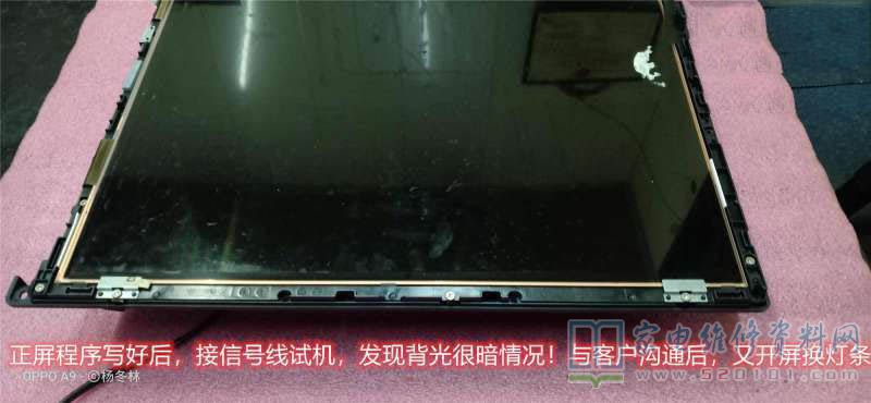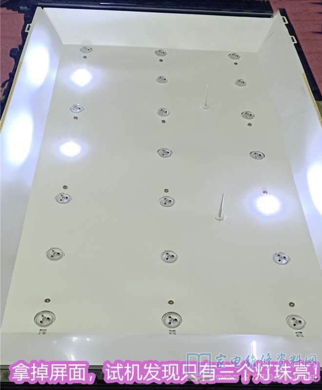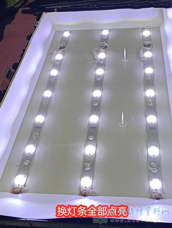 拆屏,露出灯条,上电试机,发现只是三个灯珠点亮!难怪屏幕很暗了。于是又按原机装入3V/珠,三条灯条进去。装好后试机全部点亮,装屏试机图像亮度正常了。