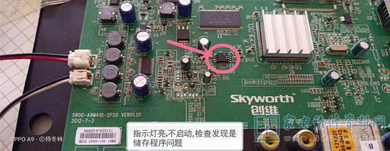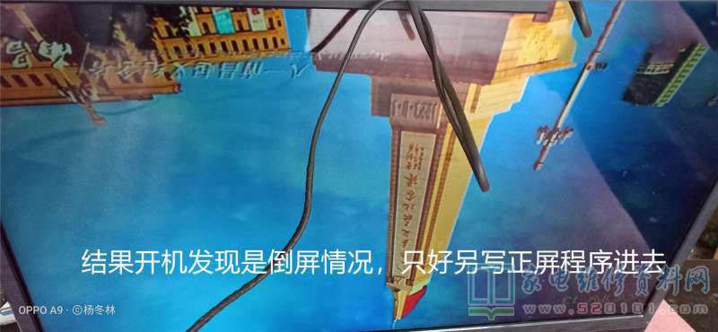 接修一台创维LED32E350E,上电开机不启动,指示灯亮,按待机键及遥控都没反应。拆后盖检测电源板各输出电压都正常,感觉是主板程序问题。于是,拆下储存块写入此机的程序,开机发现倒屏情况。又找来正屏程序写入,终于出来正屏图像,但图像却非常的暗,于是又跟客户沟通,继续换灯条。