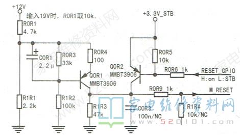 在通电瞬间,电源送来12V,因COR1两端电压不能突变,三极管Q0R1截止。同时,主芯片IO口输出高电平RESET、GPIO信号,QOR2截止,故提供给主芯片复位脚的复位信号(M_ RESET)呈低电平。随着COR1充电,Q0R1 b极电压逐渐下降,随即QOR1由截止进入导通状态,M RESET变为高电平时,复位过程完成。。测得Q0R1的c极电压为低电平,显然异常,正常时Q0R1的c极应为高电平。对此部.分电路进行检查,发现电阻R1R2阻值增大,换新后故障排除。此时测Q0R1的c极电压约为3.2V。