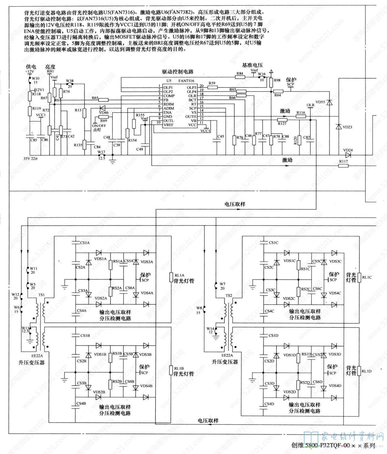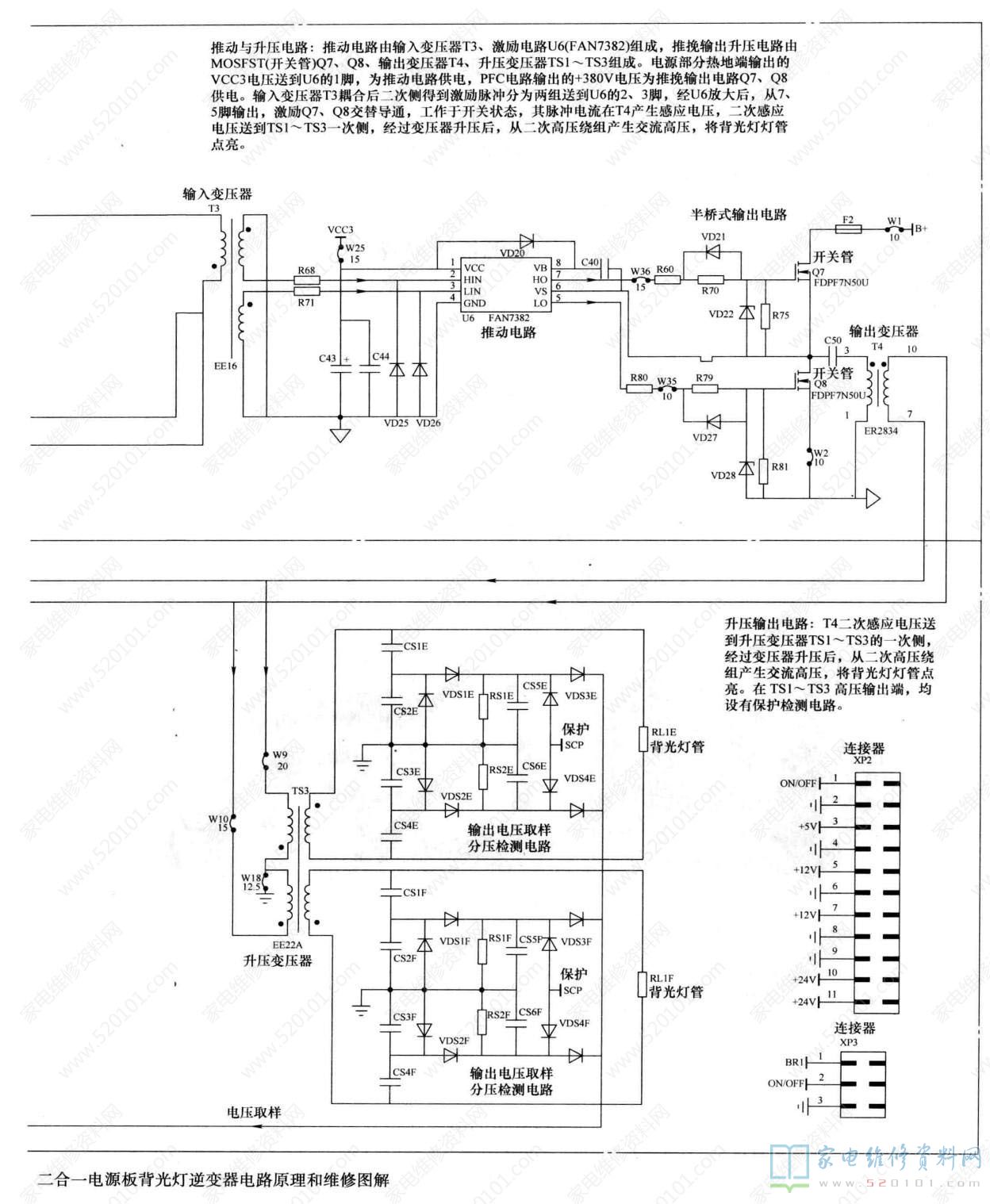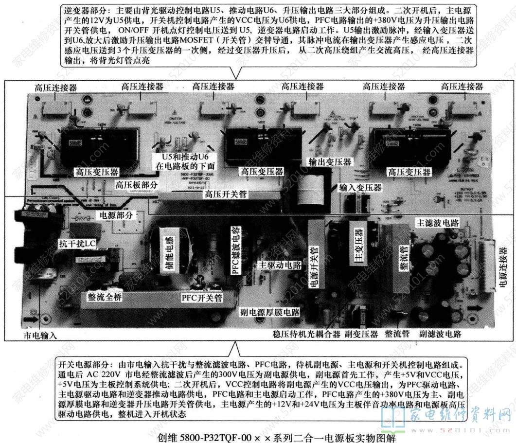 创维5800-P32TQF-00x x系列二合一电源板电路原理和维修图解如图3和图4所示;背光灯逆变器电路原理和维修图解如图5所示。