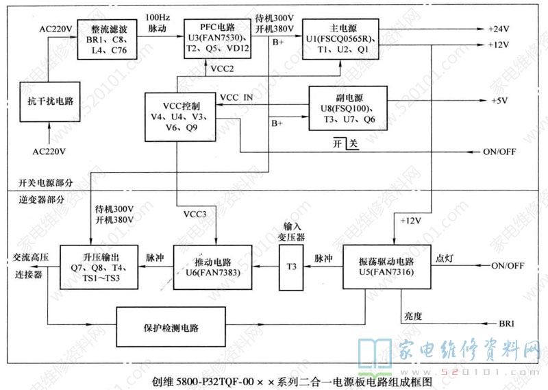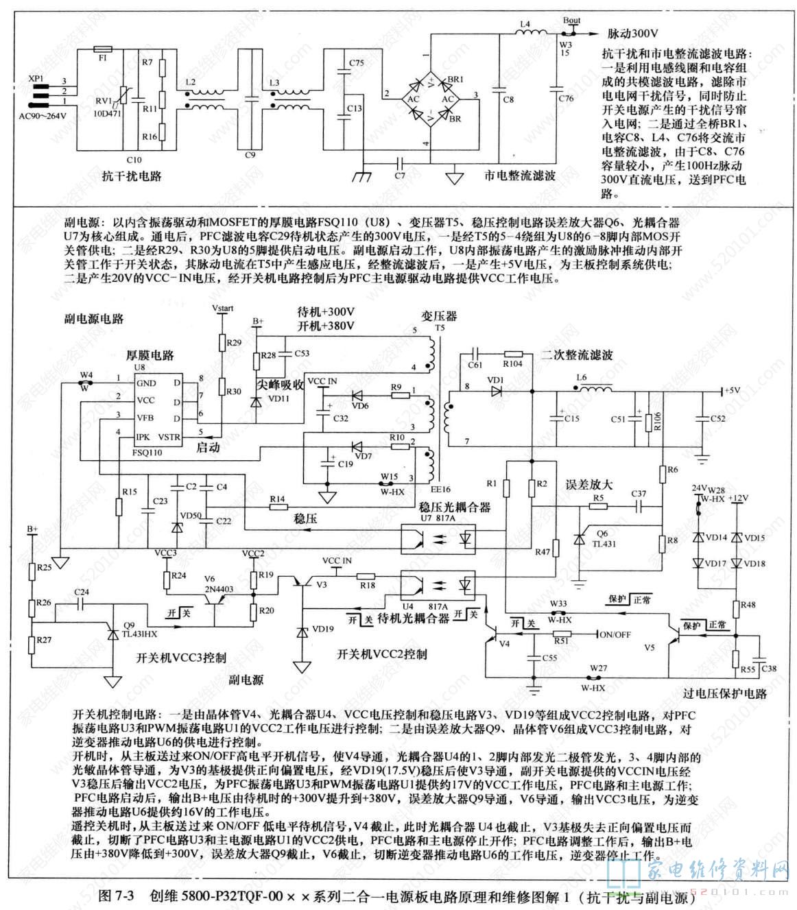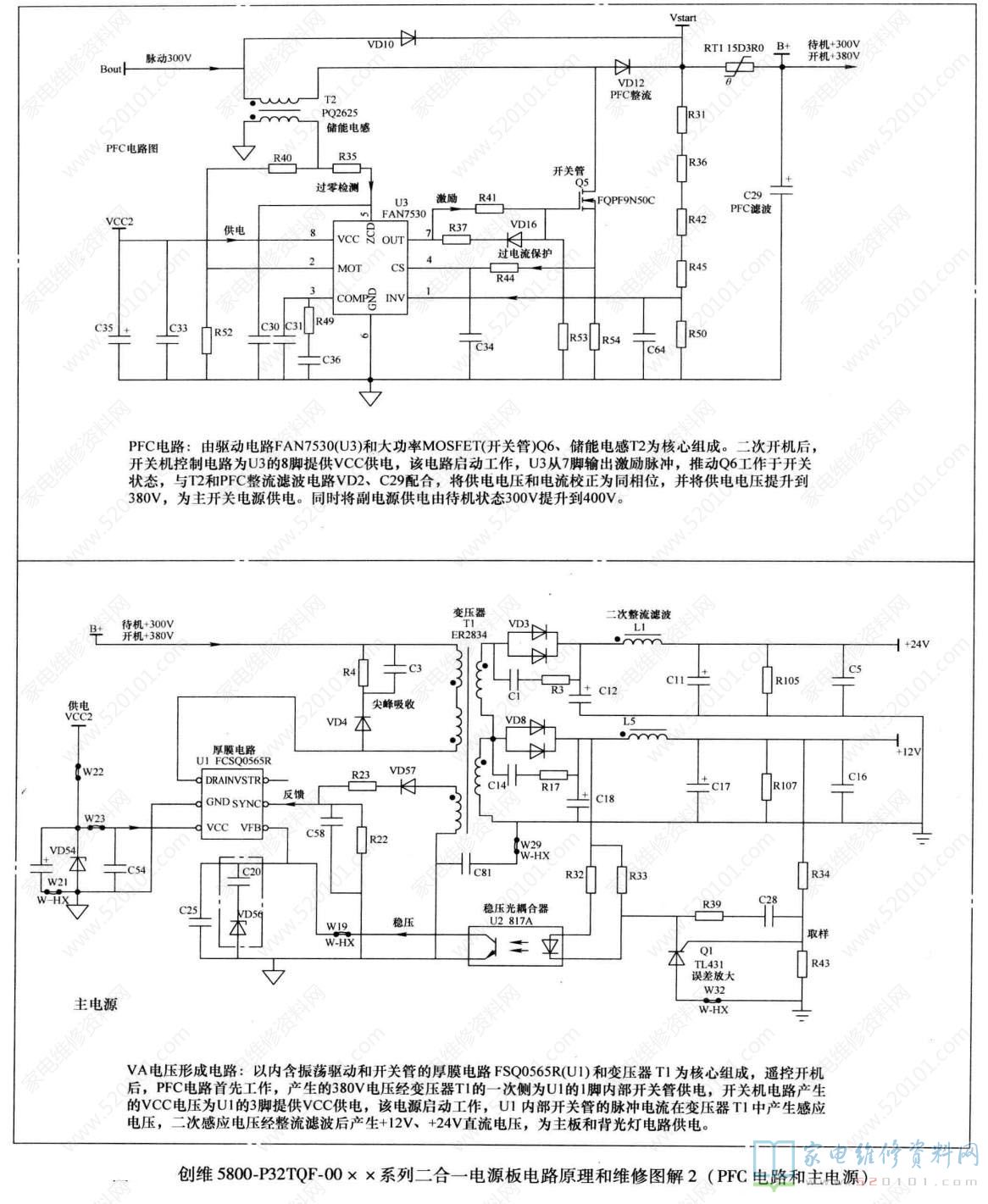 创维5800P32TQF-00xx系列二合一电源板由三部分组成: 一是以厚膜电路FSQ110 (U8) 为核心组成的副开关电源,为主板上微处理器控制系统提供+5V供电,同时为PFC电路和主开关电源驱动控制PWM电路提供18V左右的VCC工作电压;二是以驱动控制电路FAN7530 (U3) 和大功率MOSFET (开关管)Q5为核心组成的PFC电路,校正后为主开关电源提供约380V的工作电压;三是以驱动控制和大功率厚膜电路FSQ0565R (U1)为核心组成的主开关电源,为负载电路提供+ 12V、+24V 电压。