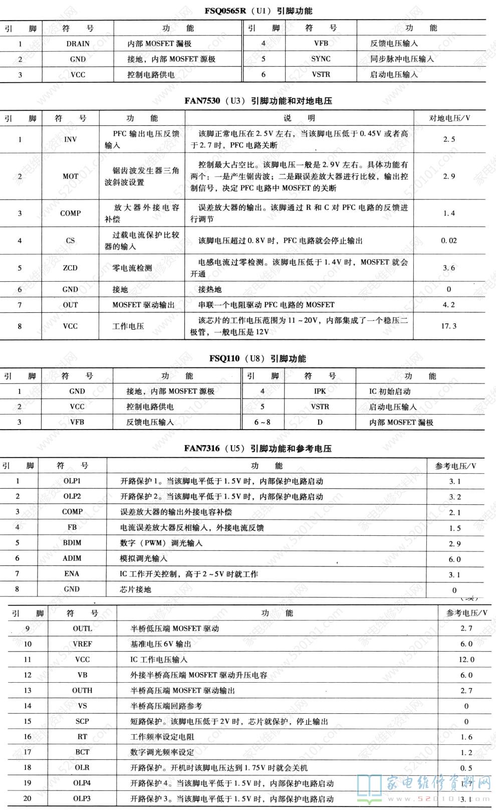 如果发生指示灯不亮的故障,故障范围在副电源部分。-是测量U8的6~8脚有无300V电压,如果无300V电压,检查AC220V市电整流滤波电路的输出端有无300V电压输出,无300V电压输出,检查市电输人电路和整流桥是否发生开路故障,如果熔丝熔断,说明电源板存在严重短路故障;二是检查U8的5脚有无启动电压,无启动电压,检查U8的5脚外部的R29、R30是否开路和烧断;三是检查副电源的稳压控制电路U7、06, 检测U8的各脚电压和对地电阻,并判断U8是否损坏,必要时,更换U8试试;四是检查副开关电源+5V的负载电路控制系统是否发生严重短路故障,严重短路会造成副电源无电压输出。