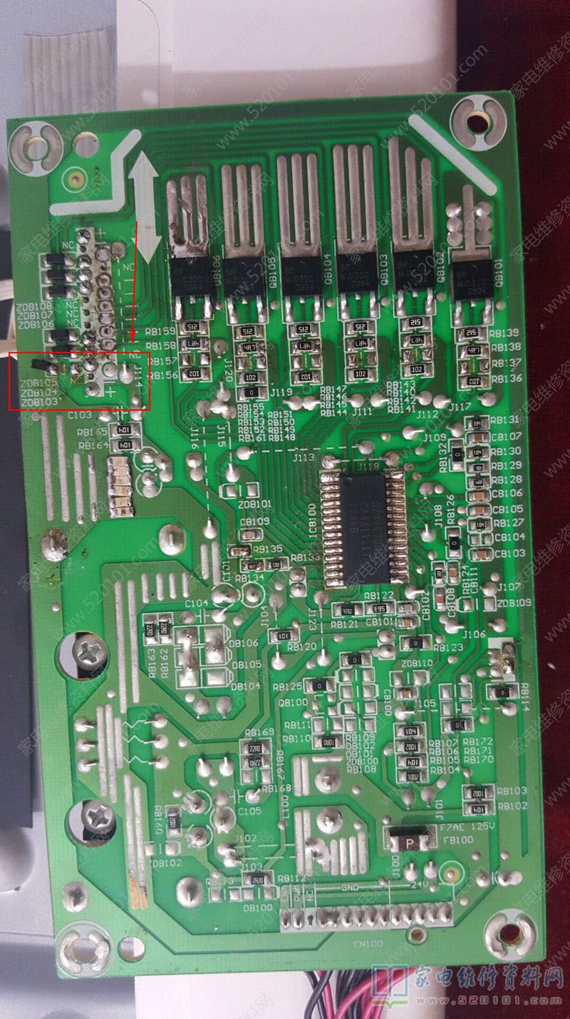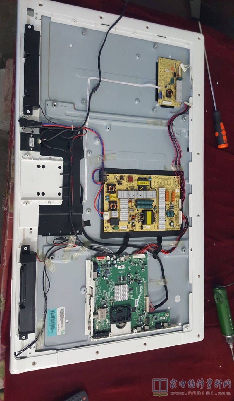 接修一台创维42E760A液晶电视,故障表现为开机图像一闪之后,就出现如下图1所示故障,初步最直观的判断就是灯坏了,拿点灯器所有LED全都能点亮,排查一遍之后发现是背光板坏了,查背光板主芯片OZ9976,此芯片非常容易损坏,更换故障依旧,此板背光共6组,只有一组工作,其他5组均不工作,查各组外围,外围件坏了(图2中的板子左上角,贴片二极管ZDB103),去掉上机背光一切正常,修复完成。