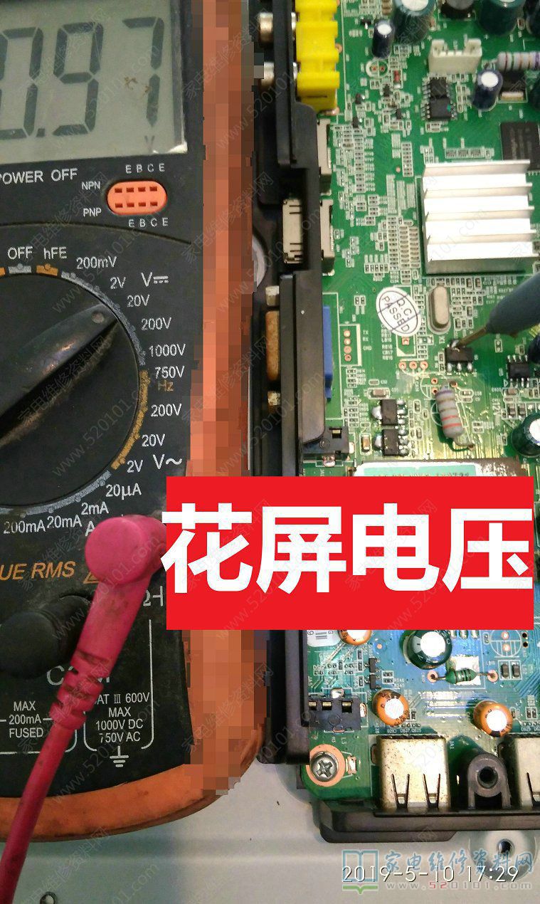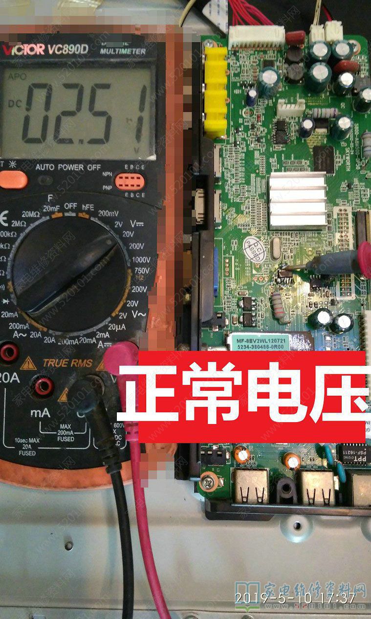 为了一探到底查故障原因,主板焊表监测电压终于发现根源是一个LM1117-ADJ输出的2.5V不稳引起的,最低时只有0.97v输出,与屏幕画面变化一致,手感不烫说明负载不重,可能是零件自身问题或者线路脱焊,换成固定型AMS1117-2.5V输出稳定,试机数日没有问题交付使用。