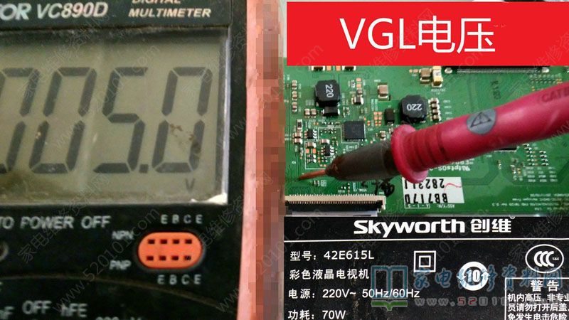 接修一台创维42E615L液晶电视,客户说电视机有声音图像时候好坏。初检查无图现象是灰屏,背光始终正常亮,判断是板线接触不良,换逻辑板加清洗排线后收钱送客,不过好景不长,几天后又回来了,再次全面检查发现图像只要一出现水平线花线就会慢慢变成灰屏,测得供屏电压VGH 28V ,VGL-5V 及另外几个均正常,对比考虑两张逻辑板一样问题,有时搬动电视能够恢复正常画面,遂怀疑屏幕内部线路不良,不死心外接主板点屏一直正常,排除屏不良问题在主板。