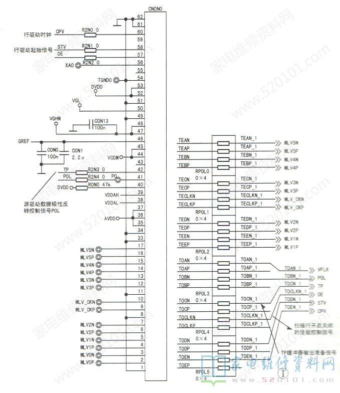 接修一台创维32E3500型液晶电视(9R43机芯),故障表现为花屏,伴音正常。主芯片RTD2982DQ(UD1 )的89脚(3.3V)为LVDS处理单元供电端,77~103脚是5对LVDS信号MLVIP/MLV1N ~MLV5P/MLV5N、时钟信号MLV_ CKN/MLV_ CKP、屏工作驱动命令信号CPV、STV、OE、TP的输出端。这些信号通过RPOLO~RPOL5(0Ω)及连接器CN0N0送给TCON电路,如图1所示。