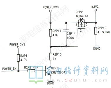 上电测U2P0输出3.3V正常,但Q2P2输出的M3V3电压仅1.2V,显然不正常。检查M3V3电压形成电路,如图1所示。短接Q2P2的D、S极,此时M3V3电压正常,由此判断M3V3电压负载正常。检查Q2P2外围元件,发现电阻R2P8虚焊,补焊R2P8后故障排除。