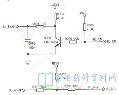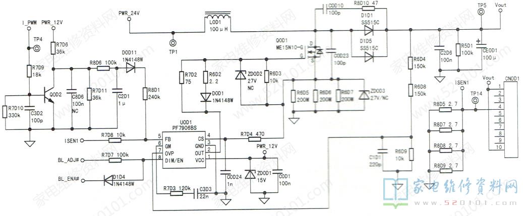 检查BL ADJ电路,发现上拉电阻R0P0已开路,导致BL ADJ电压太低,D1D4截止,PF7906BS的⑧脚电压达不到启动值,PF7906BS不工作。更换R0P0后,⑧脚电压升到3V背光点亮,故障排除。