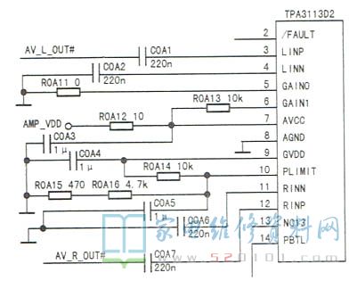 接修一台创维32E3500型液晶电视(9R43机芯),故障表现为伴音声音小。该机伴音功放采用TPA3113D2。本故障主要与功放的⑧脚功率限制端,⑤、⑥脚增益设置端,③、④脚R、L音频输入端电路通道及功放自身有关,相关电路如图1所示。