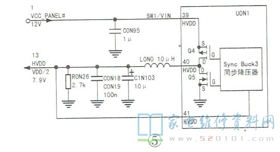 如果HVDD供电无输出,先检查UON1 39脚的供电,然后检查HVDD供电回路,最后检查UON1;如果HVDD供电偏高,应检查UON1;如果HVDD供电偏低,先检查HVDD供电回路,然后检查UON1。相关电路见图5。