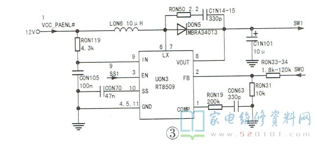 6、 SW1供电异常如果SW1供电无输出,先检查sW1供电输出回路,然后依次检查UON3⑨脚的供电、③脚输入来自UON1 19脚的SS1芯片使能信号、10脚外围的软启动电容、⑥脚外围的升压电路②脚外围的反馈回路、①脚外围的滤波电路,最后检查U0N3;如果SW1供电偏高,先检查U0N3②脚的反馈回路,然后检查UON3;如果sW1供电偏低,检查SW1供电输出回路是否过载,然后检查U0N3②脚外围的反馈回路及升压电路,最后检查U0N3。相关电路见图3。
