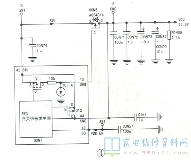 如果VDD供电无输出,先检查VDD供电回路,然后检查U0N1 42脚输出到U0N5信号通路、44脚VDD反馈回路,最后检查UON1;如果VDD供电偏高或屡烧UON5,先检查U0N1 44脚VDD反馈回路,然后检查U0N1;如果VDD供电偏低,先检查VDD供电回路,然后检查 44脚的VDD反馈回路,最后检查U0N1。相关电路见图4。