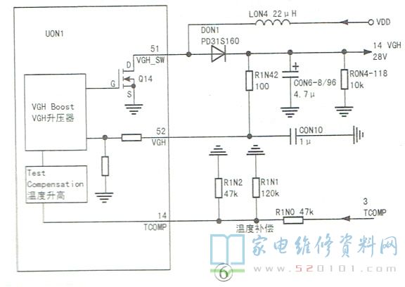 如果vGH供电无输出,先检查VGH供电回路,然后检查UON1;如果vGH供电偏高,先检查L0N4,然后检查U0N1;如果VGH供电偏低,先检查VGH供电回路,然后检查U0N1的52脚反馈回路,最后检查U0N1。相关电路见图6。