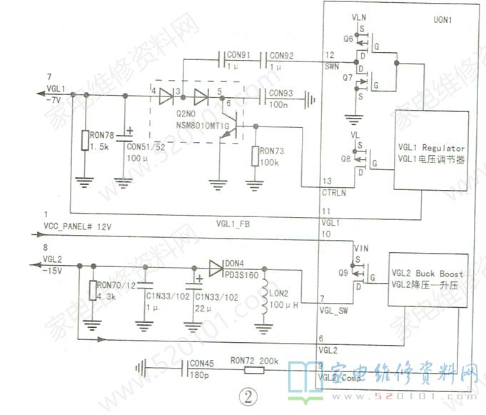 如果vGL2供电无输出,先检查UON1的⑦脚外围电路,然后检查VGL2的充、放电回路,最后检查UON1;如果VGL2供电偏高,先检查vGL2负载,然后检查UON1;如果vGL2供电偏低,应检查UON1内部的VGL2降压-升压器。相关电路见图2。