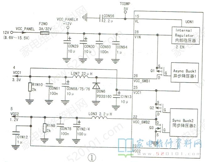 如果VCC1无输出,应先检查UON1的④脚外围电路,然后检查U0N1内部的异步降压器1和Q1;如果vCC1偏高,检查UON1中的异步降压器1;如果vCC1偏低,先检查UON1的②脚外围电路,再检查UON1。相关电路见图1。