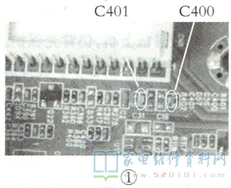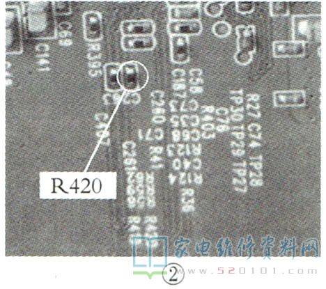 接修一台创维50E780U液晶电视,开机后音量自动加到“100”。仔细检查PCB板正反面,没有发现异常。接上串口工具,通电查看打印信息正常。上电测量键控接口KEY0、KEY1端(测试点为电容C400、C401非接地端,如图1所示)电压均为3.19V,正常。升级主程序后试机,故障依旧。怀疑板材漏电,顺着C400、C401处的铜箔检测,发现PCB背面电阻R420虚焊,如图2所示,导致主芯片KEY0端悬空(正常为上拉3.3V)。补焊R420后试机,故障排除。